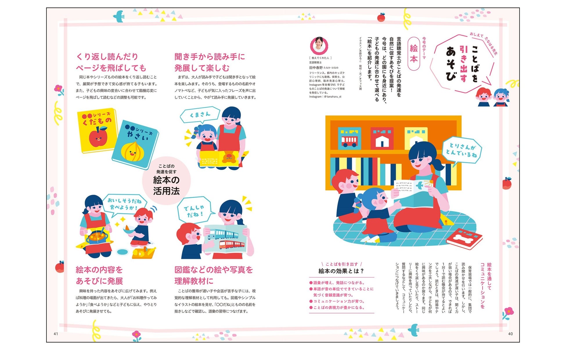 今号では、ことばを引き出す「絵本」の効果や活用法を取り上げます。子どものことばの発達に合わせてセレクトした絵本15冊を、読み聞かせのポイントとともにご紹介!