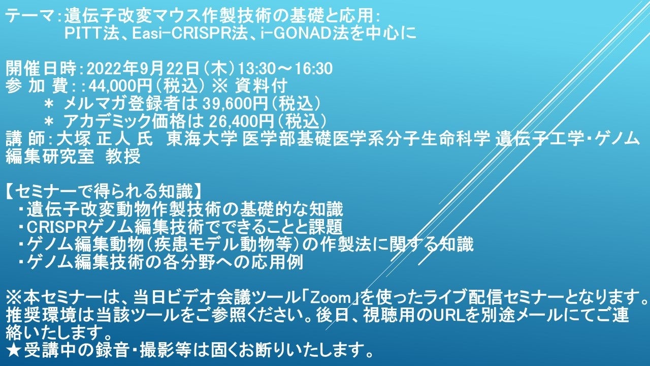 先端技術情報や市場情報を提供している(株)シーエムシー・リサーチ(千代田区神田錦町: https://cmcre.com/ )では、 各種材料・化学品などの市場動向・技術動向のセミナーや書籍発行を行っておりますが、 このたび「遺伝子改変マウス作製技術の基礎と応用:PITT法、Easi-CRISPR法、i-GONAD法を中心に」と題するセミナーを、 講師に大塚 正人 氏 東海大学 医学部基礎医学系分子生命科学 遺伝子工学・ゲノム編集研究室 教授)をお迎えし、2022年9月22日(木)13:30より、 ZOOMを利用したライブ配信で開催いたします。 受講料は、 一般:44,000円(税込)、 弊社メルマガ会員:39,600円(税込)、 アカデミック価格は26,400円(税込)となっております(資料付)。