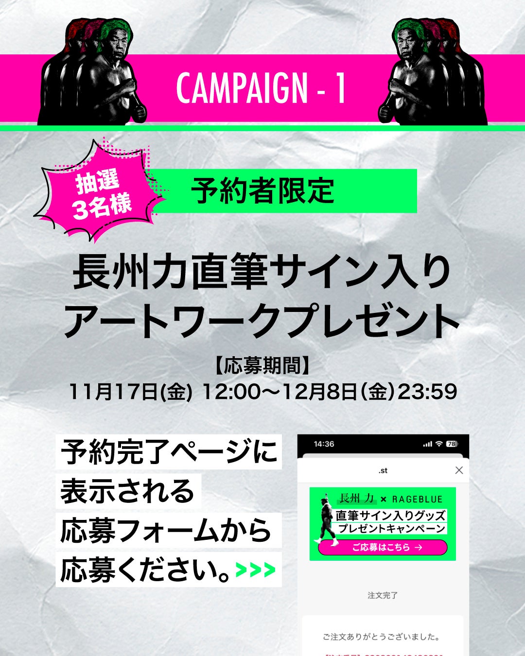 今回は、20代の男女をターゲットとする「RAGEBLUE(レイジブルー)」とコラボし、長州さんが数多く残してきた“名言”をモチーフとしたアイテム全6型が登場。サイズはS、M、Lだけでなく、3XLの長州力サイズも展開!11月17日(金)12:00よりドットエスティにて予約受付がスタートします。さらに、長州さんのサイン入りアートワークが当たるプレゼントキャンペーンを2種類実施します。