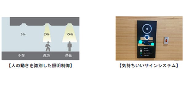施設内に設置した画像センサーによって、エリア内の人数や人の動きを検知・識別することで、場面に合わせた明るさに自動調節し、照明エネルギーを削減しています。また、同センサーによるデータと室内外の空気質・気温などのデータをもとに、最適な外気導入のタイミングを利用者に知らせる「気持ちいいサインシステム」を導入し、建物内に効率的に風を取り込むことで、空調稼働削減につなげています。
