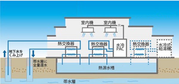 年間を通して一定の温度を保つ地下水を熱源として空調と給湯に利用することで、エネルギー使用量を大幅に削減しています。また、空調時の排熱を大気に放出しないため、ヒートアイランド現象の緩和にも寄与しています。