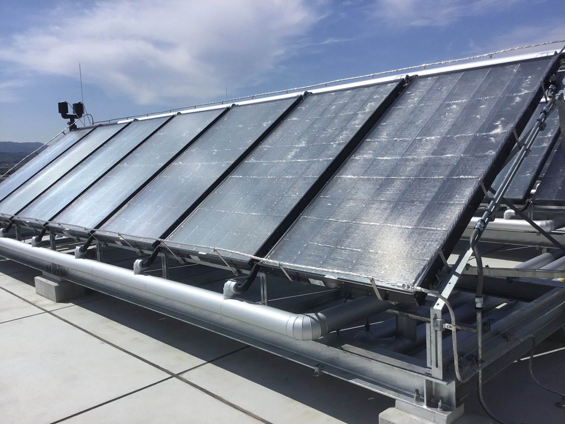 太陽光発電システム100kWとリチウムイオン蓄電池10kWhを連携させ、発電した電力は建物内で全て自家消費しています。あわせて、太陽熱集熱パネルを設置し、太陽熱を給湯利用することで給湯エネルギーの使用量を削減しています。