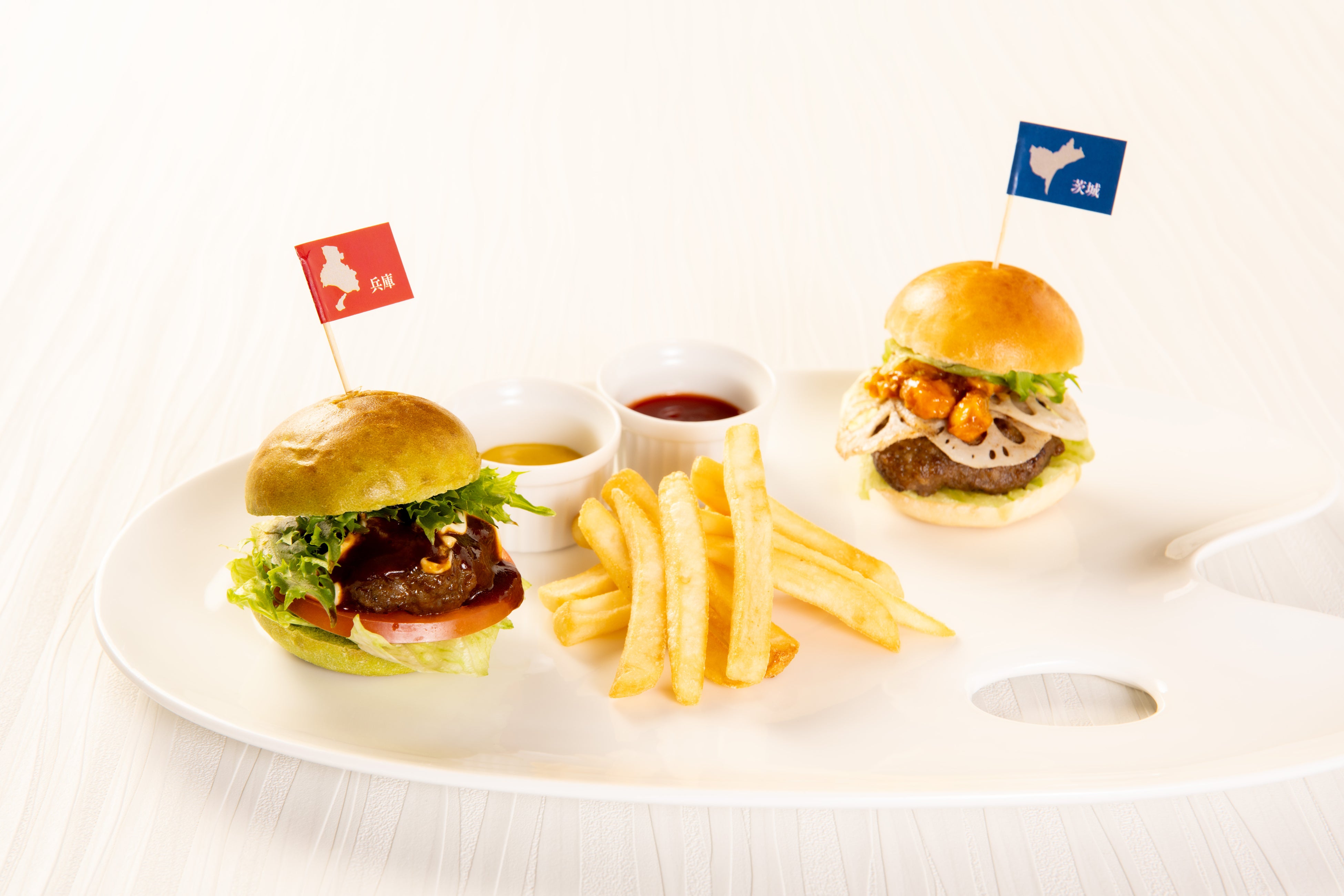 カフェレストラン「カメリア」では、兵庫県と茨城県の食材を合わせた『淡路産牛と常陸牛 食べ比べハンバーガー』『神戸ポークのしゃぶしゃぶと常陸の輝きポークカツレツのカレー』をご用意します。