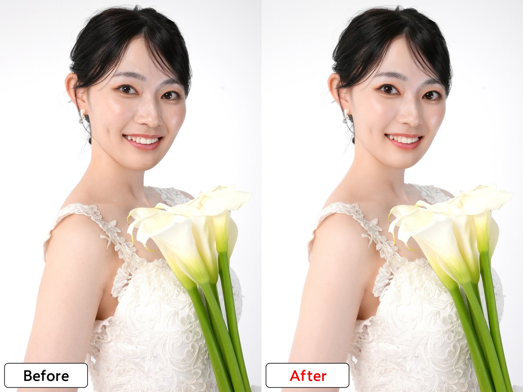 本ソフトはあくまでも写真スタジオでの適切な仕上がりを意識し、専用に開発しています。フリューがプリントシール機の開発で培った盛りのノウハウと感性を活かしつつも、写真スタジオという撮影環境や撮影目的を考慮し、過度に盛る選択肢は含まず、ドレスや和装など特別な衣装やヘアスタイルの仕上がりを損ねないといった部分も配慮しております。そのため、お客様のご本人らしさを重視した自然な仕上がりとなっています。また、被写体の人数や、全身や横顔など様々な画角でも適切に認識し、加工が反映されるようこだわって開発しております。