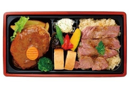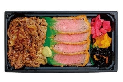 牛カツ弁当と黒毛和牛カルビ弁当、2種類の味を1つの弁当で楽しめます。