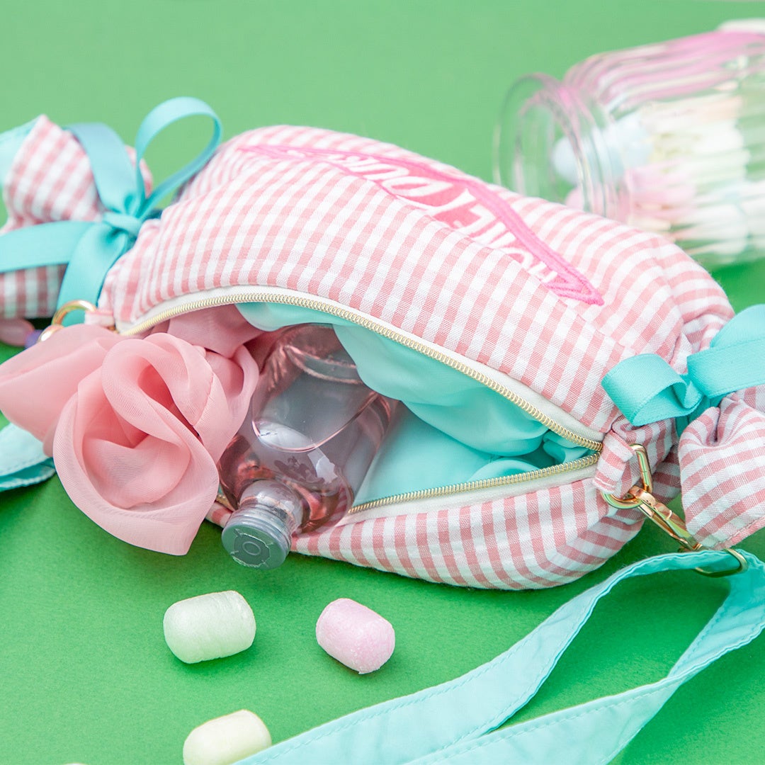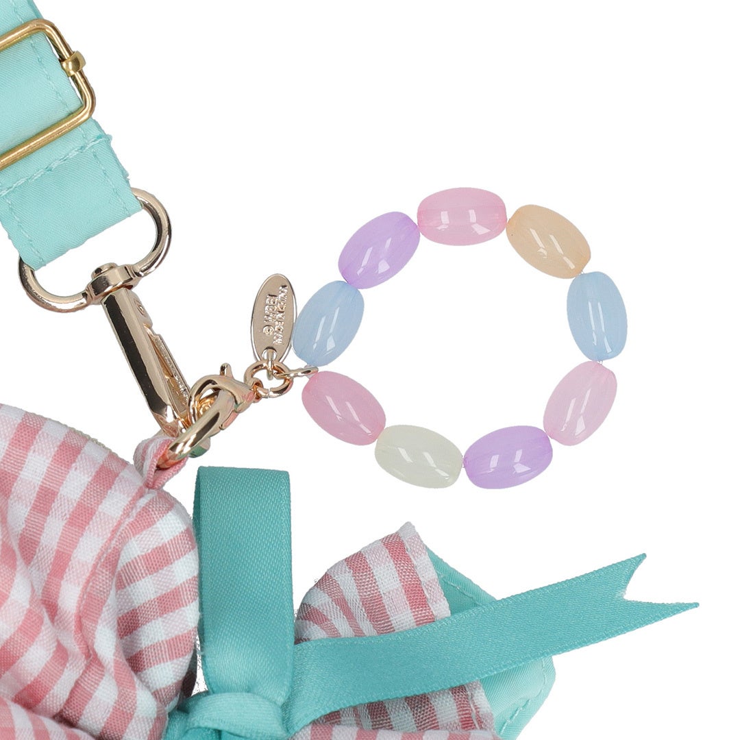 ピンク色のギンガムチェックとリボンのミントグリーンがかわいらしいデザインのキャンディ型ポシェットです。内生地はリボンと同色のミントグリーンで仕上げ、鍵やコスメの収納に便利な内ポケットが付いています。長さを調整できるアジャスター付きのショルダー紐は取り外し可能で、ポシェットだけでなくポーチとしても使用できます。ファスナーの引手部分についたバーティー・ボッツの百味ビーンズのチャームがポイントの、ファッションのアクセントにぴったりなアイテムです。