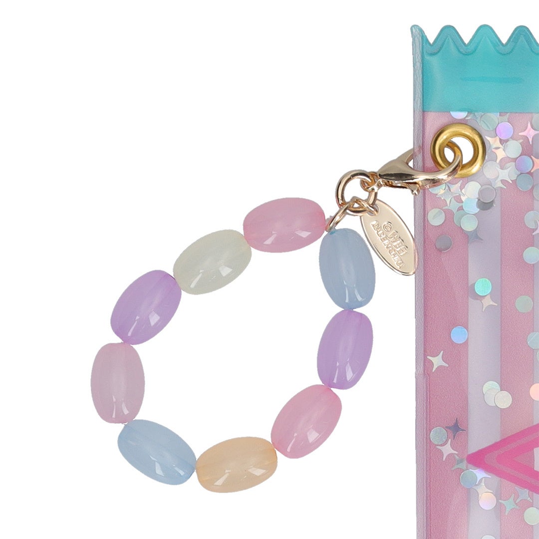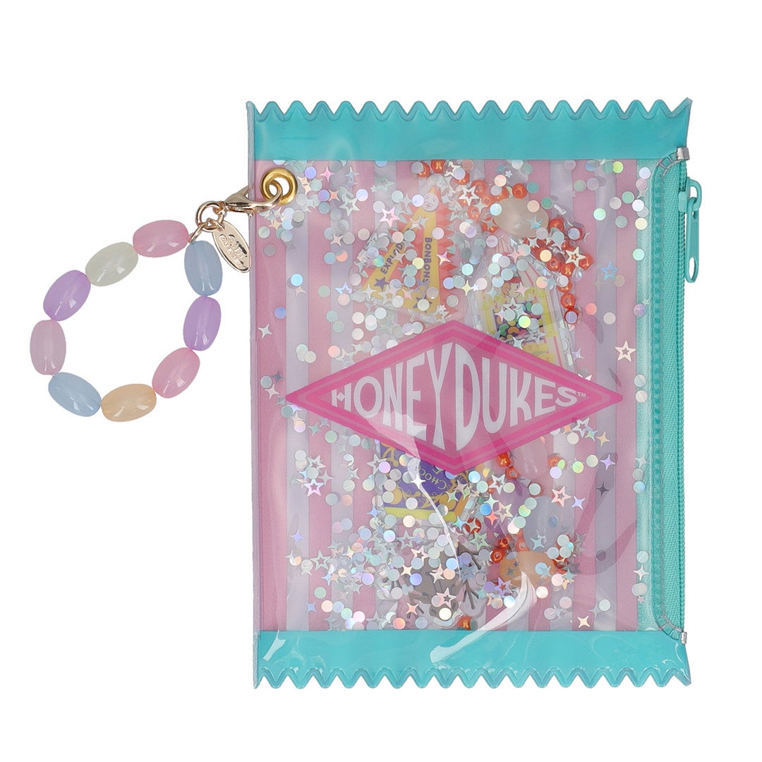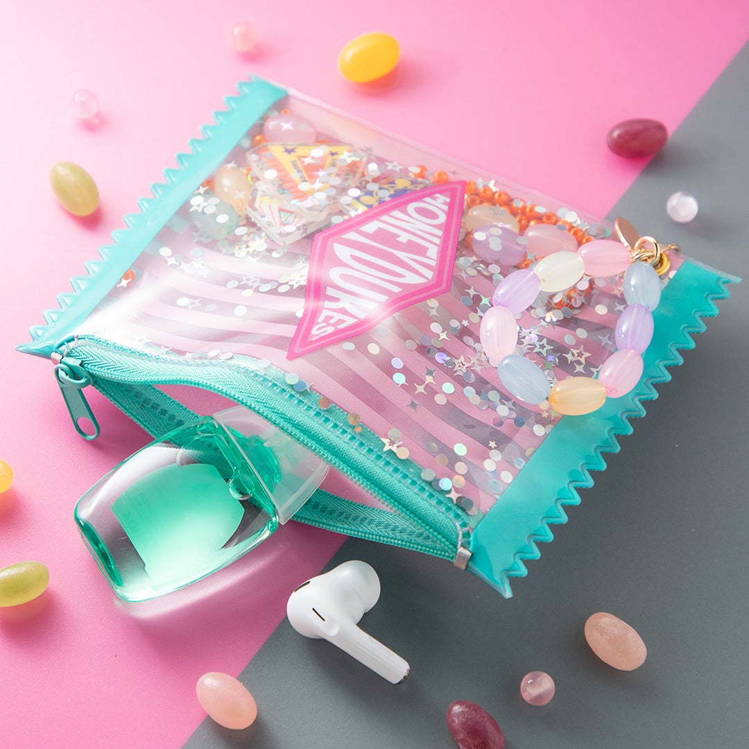 蛙チョコレートやバーティー・ボッツの百味ビーンズ、爆発ボンボンなど「ハニーデュークス」で販売されている定番のお菓子のモチーフを詰め込んだポーチです。振ったり傾けたりすることでモチーフ同士がシャカシャカと音を立て、ビーズやラメがキラキラと輝きます。リップや絆創膏、薬などを収納可能なサイズ感で、中身が見える便利なクリア仕様です。
