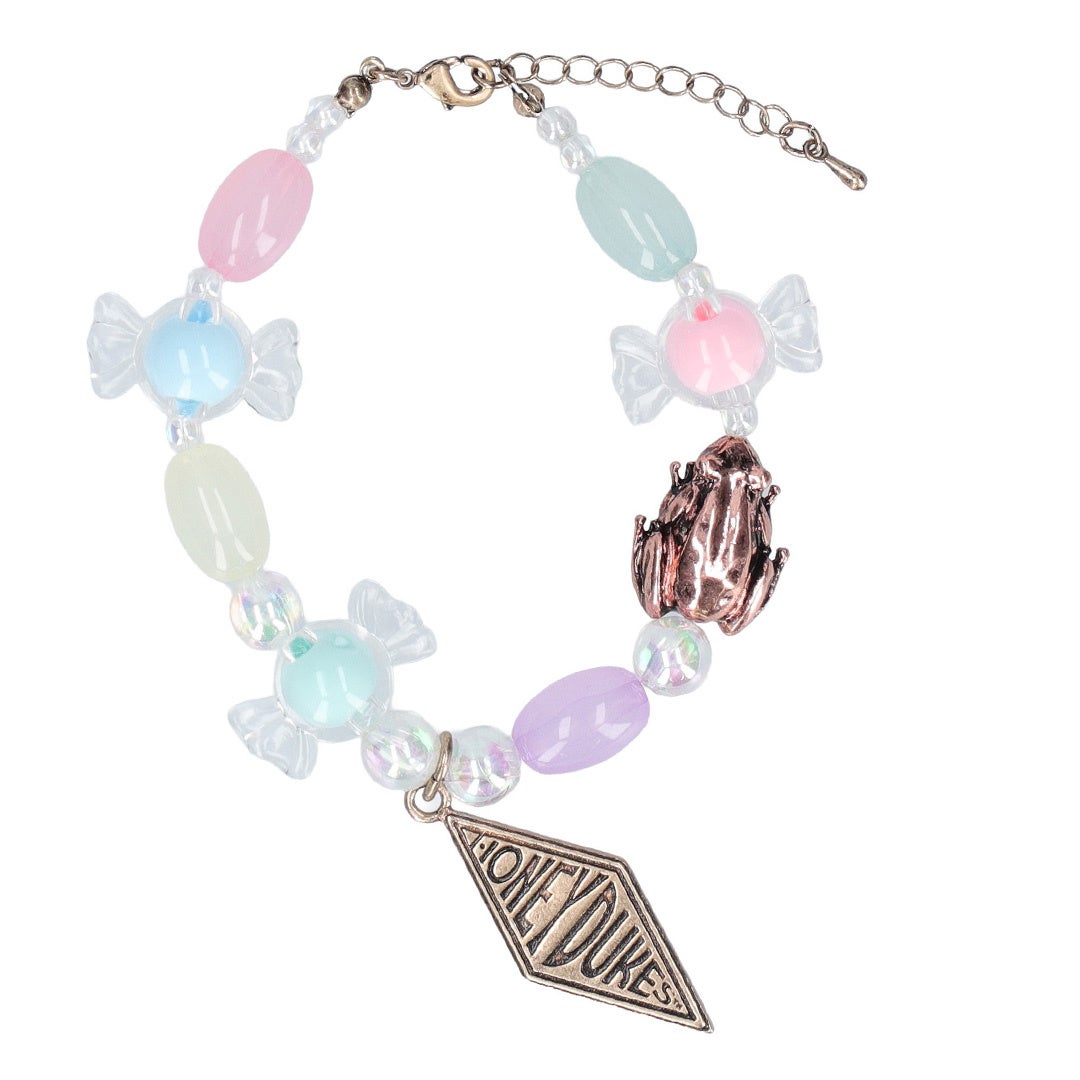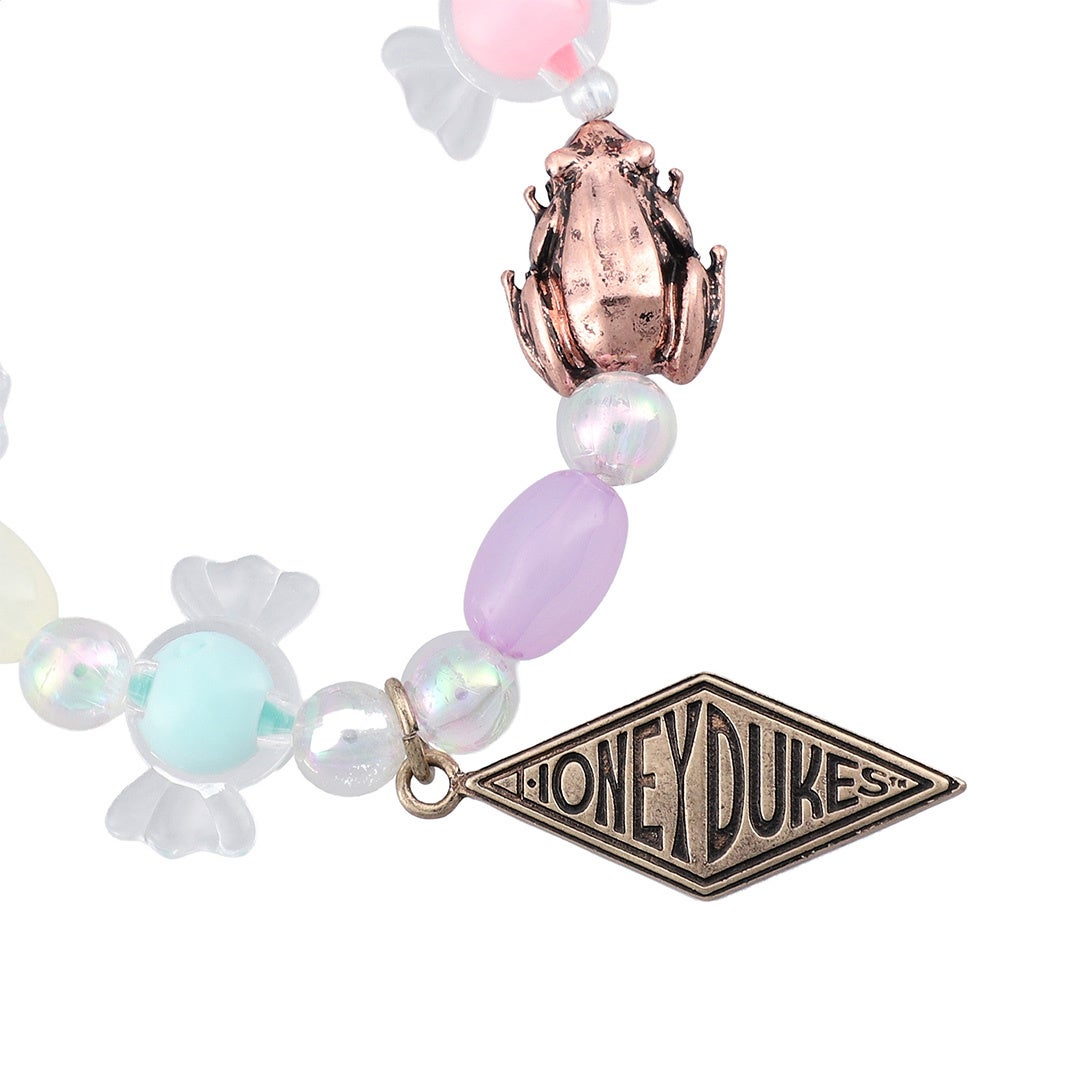 百味ビーンズやキャンディの形のビーズの、ハニーデュークスデザインのブレスレットです。パステルカラーのビーズにプラスして、アクセントになる蛙チョコレートやハニーデュークスのメタルパーツをあしらいました。同日発売のネックレスセットやピアスセットと合わせて着用するのもおすすめのアイテムです。