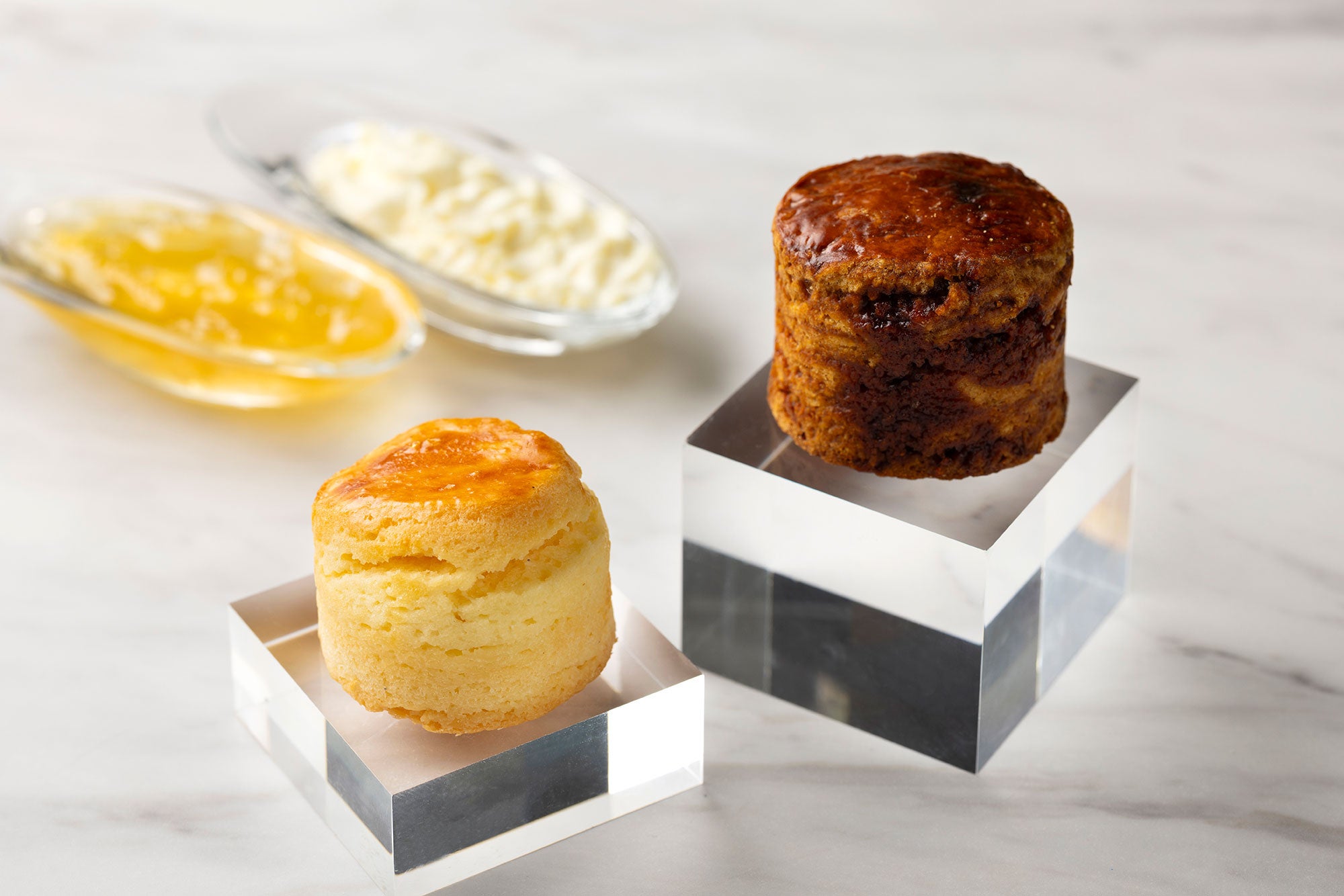 キャラメルスコーンと発酵バター、2種のスコーンをご用意。クロテッドクリームと爽やかなベルガモットジャムを添えてお召し上がりいただけます。