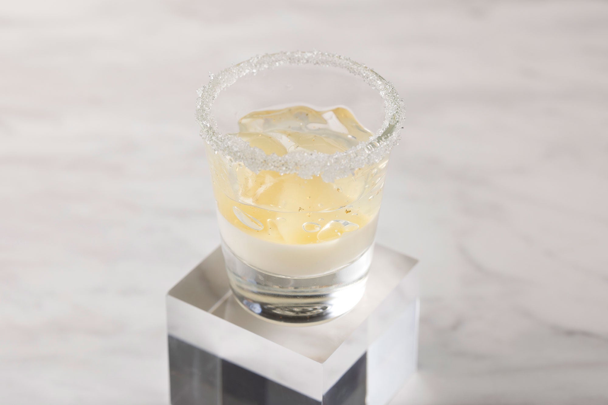 洋梨のコンポートにレモンゼリーを重ね、爽やかな風味に仕上げたグラススイーツ。グラスの縁には雪をイメージしたグラニュー糖をあしらいました。