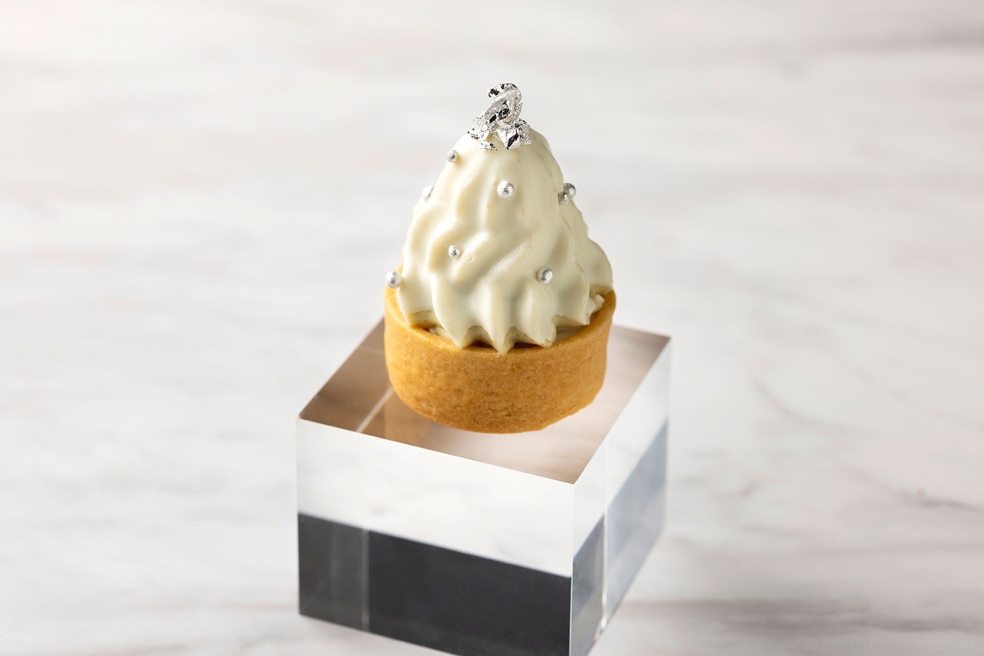 軽やかなピスタチオクリームを絞り上げ、雪が積もったホワイトクリスマスツリーに見立てたタルトです。
