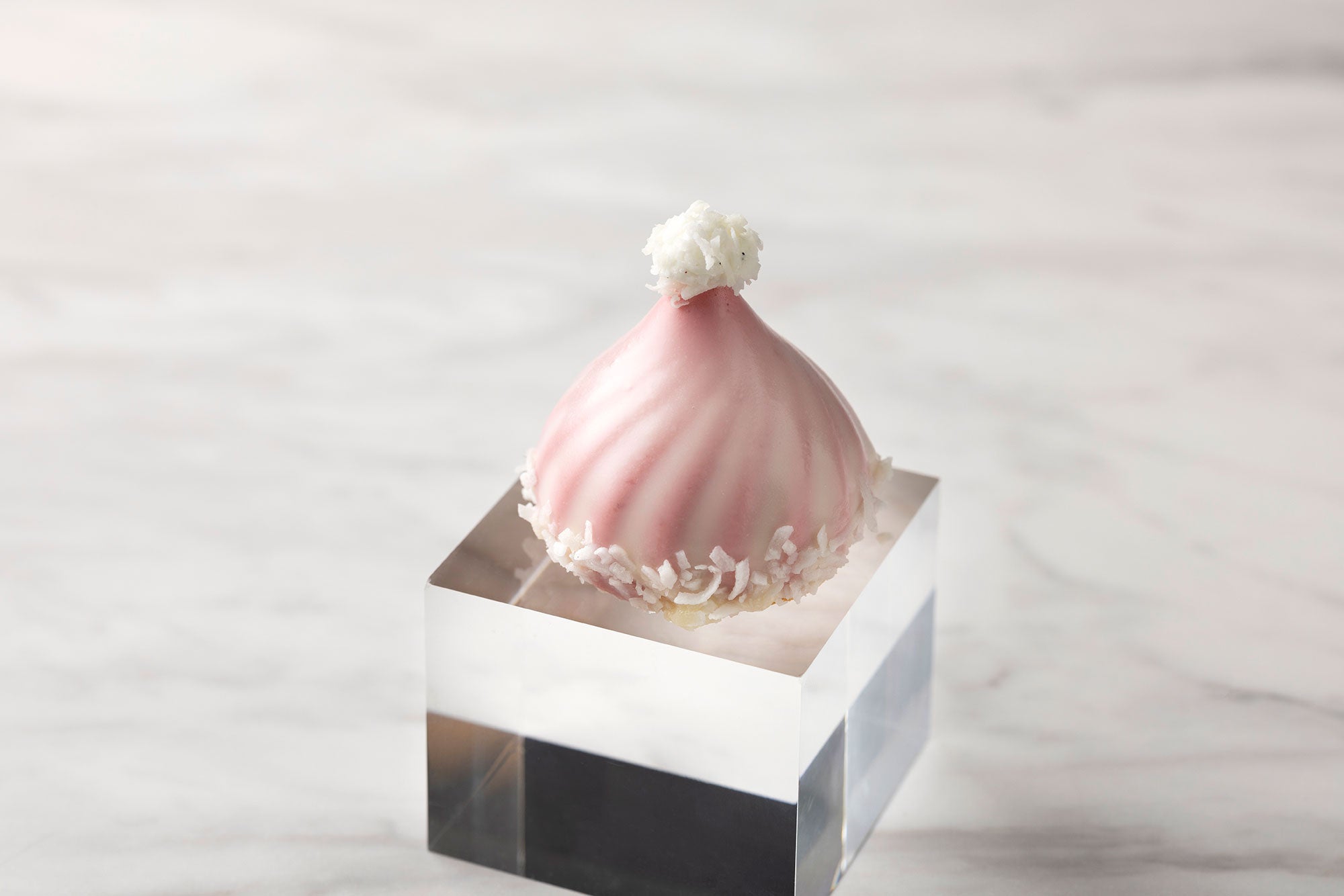 薄ピンクのドレープが映える、爽やかな甘酸っぱさのベリームースでつくったサンタ帽子のスイーツです。