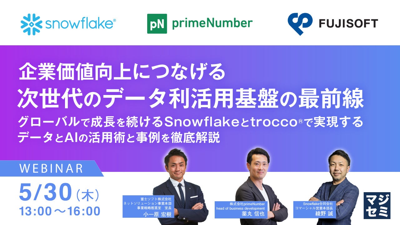 本セミナーでは、グローバルで多くの企業で選ばれているデータプラットフォーム「Snowflake」 と総合データ基盤支援サービス「trocco®」を組み合わせた「次世代のデータ利活用基盤」の最前線の活用術と導入事例をご紹介します。