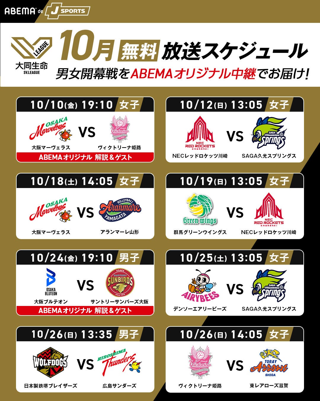 「ABEMA de J SPORTS」にて『2025-26 大同生命SV.LEAGUE』を全試合生中継!レギュラーシーズン男子・女子合計88試合を無料生中継!月1回は「ABEMA」オリジナル解説付き