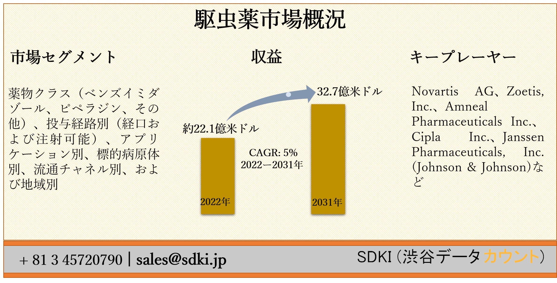 SDKI Inc.が「駆虫薬市場ー世界的な予測2022ー2031年」の新調査レポートを2022年03月01日に発刊しました。レポートは、業界の新ビジネスチャンスとともに、市場とその成長見通しの完全な評価を提供します。さらに、2022ー2031年の予測期間中の市場規模と年間成長率が含まれています。