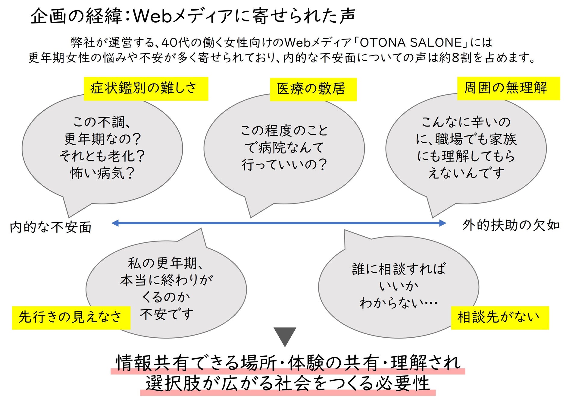 また、なぜ女性にこれら特有の不調や困難が起きるのか、身体がどのような変化を迎えているのか、わかりやすく正しい情報を得てもらうための場を創出します。男女や世代を問わず一人でも多くの方にジョインしていただき、お互いの状況を語り合っていただくことが目的です。
