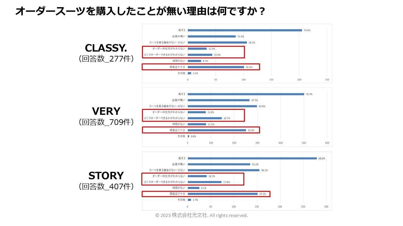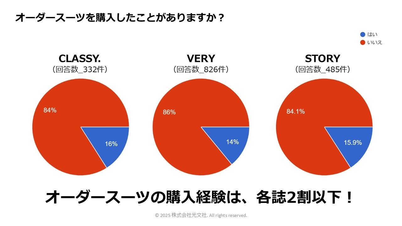 『CLASSY.』、『VERY』、『STORY』の3誌すべてで、「オーダースーツ」の購入経験は全体の14~16%と低い結果に。