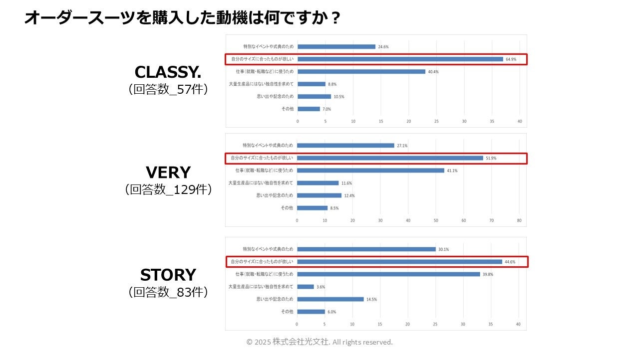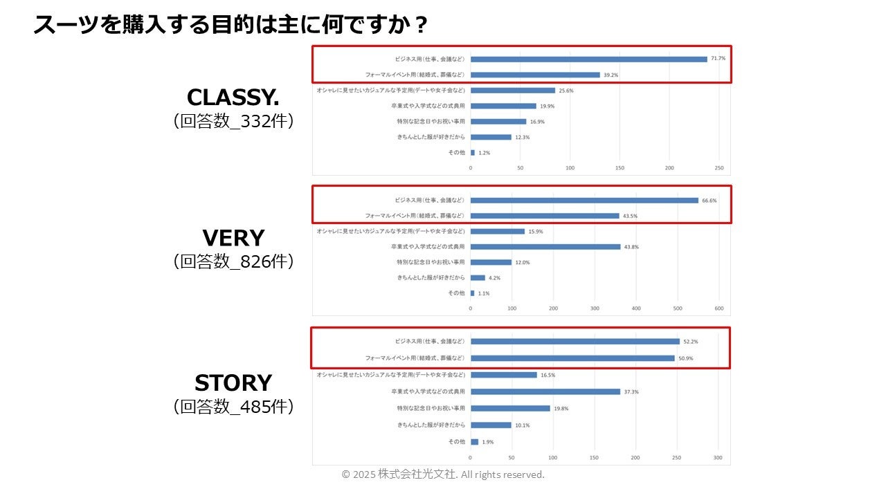 『JJ』、『CLASSY.』、『VERY』、『STORY』・・・各ライフステージに寄り添う女性メディアを運営する光文社では、毎月読者調査を行い、コンテンツづくりをしています。その中で、「きちんとファッション」の王道である「スーツ」と「オーダースーツ」に関して、『CLASSY.』、『VERY』、『STORY』の3誌連動でインサイト調査を行いました。