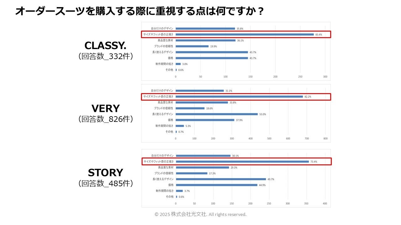 ・オーダースーツを購入時に重視したい点のNo.1は圧倒的に「サイズやフィット感の正確さ」。