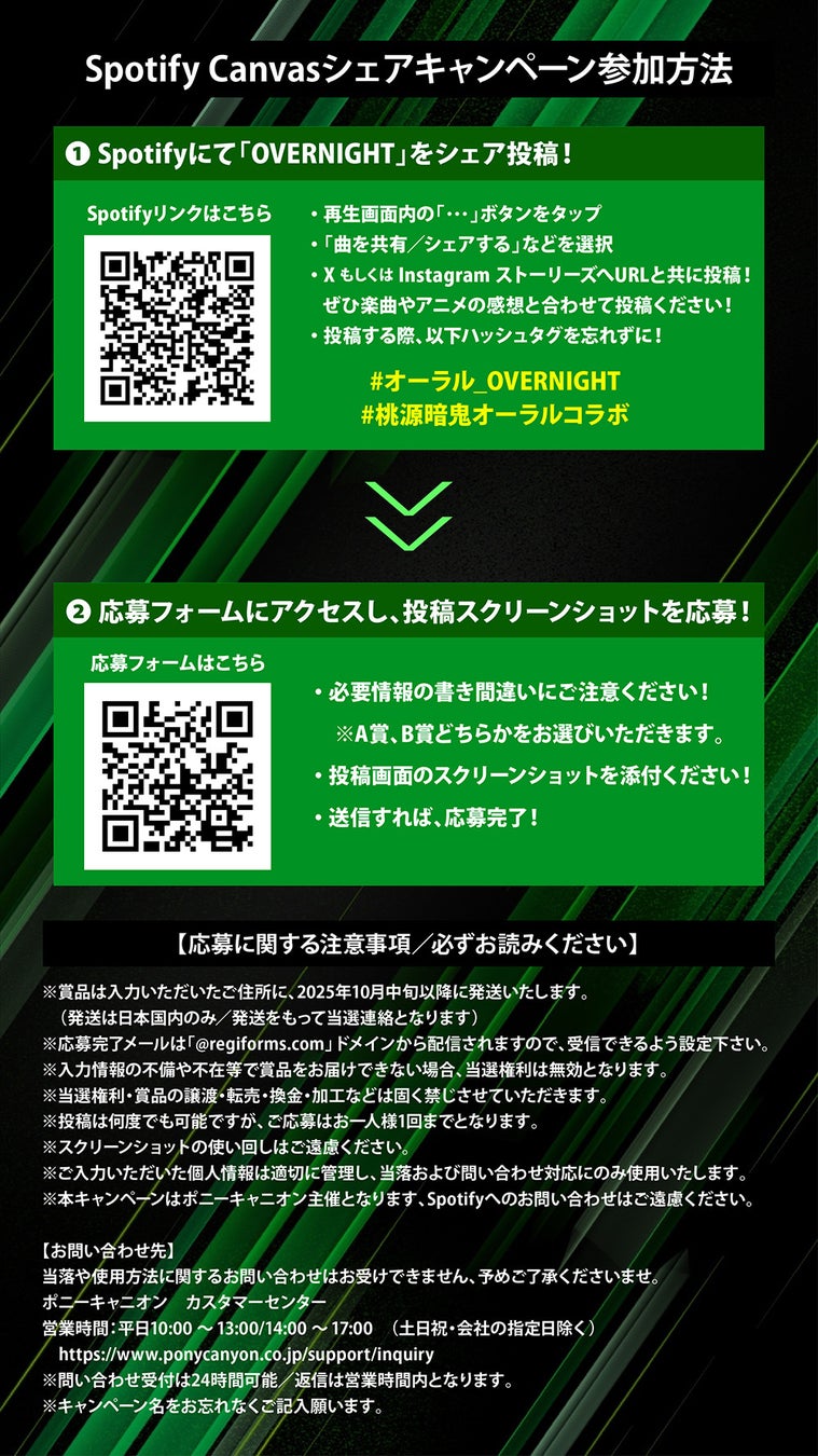 期間中にSpotifyで「OVERNIGHT」を再生すると、週替わりでTVアニメ「桃源暗鬼」のキャラクターがCanvasという再生画面に登場。さらに、X(旧Twitter)やInstagramストーリーズで、ハッシュタグ「#オーラル_OVERNIGHT」「#桃源暗鬼オーラルコラボ」を付けて楽曲やアニメの感想をシェアし、応募フォームに登録すると、オリジナルプレゼントが当たるキャンペーンが同時にスタートした。「桃源暗鬼」ポストカードと「OVERNIGHT」オリジナルステッカーが抽選で当たるのでぜひ応募しよう。