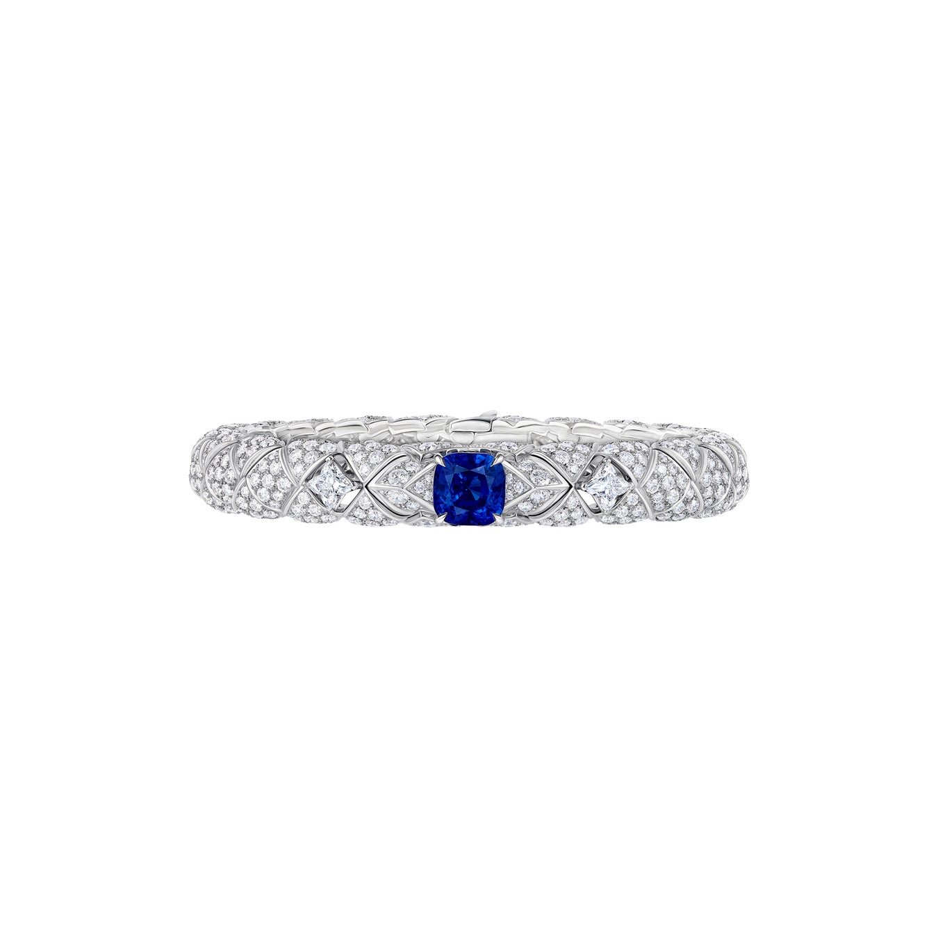 また、メゾンのハイジュエリー·コレクション「Awakened Hands, Awakened Minds(アウェイクンド ハンズ アウェイクンド マインズ)」の「パーセプション」より、クッションカットの5.83カラットのサファイアをあしらったブレスレットと、さらにメゾンのハイジュエリー·コレクション「ピュア V」よりホワイトゴールドとダイヤモンドのイヤリングも着用しました。