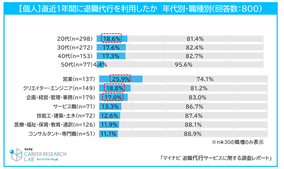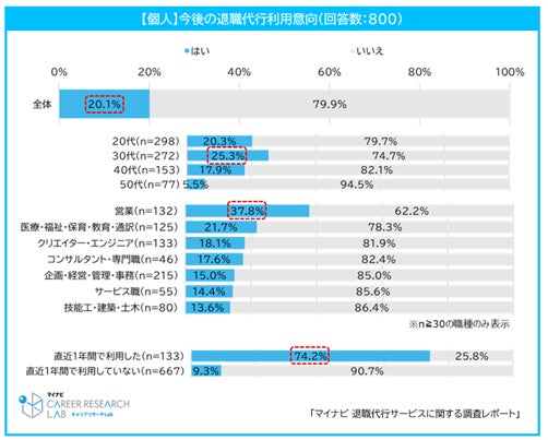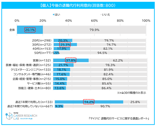 今後退職代行を利用したい人は20.1%で、直近1年間で退職代行を利用した人に限ると、74.2%が「今後も利用したい」と回答した。また、年代別では30代が25.3%で最も高く、職種別では利用結果と同様に「営業」が最も高かった。【図3、4】