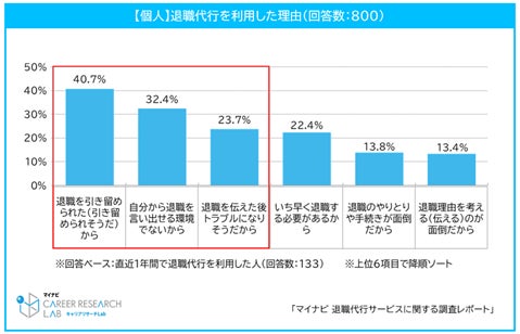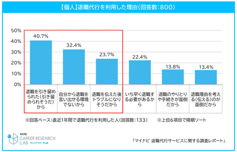 直近1年間に転職した人で退職代行を利用した人は16.6%。 「引き留められたから」「退職を言い出せる環境でない」が理由の上位