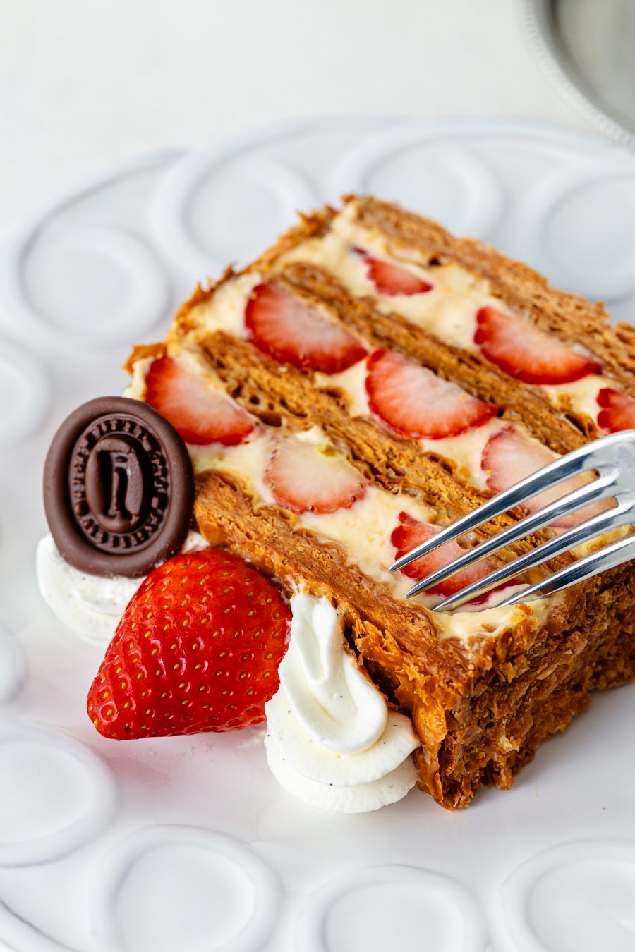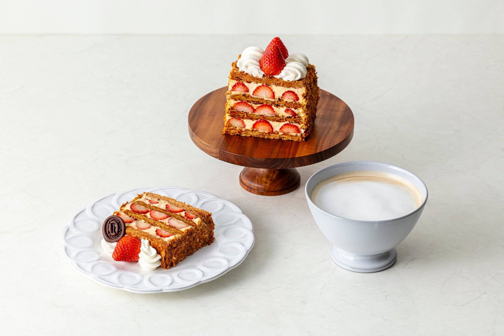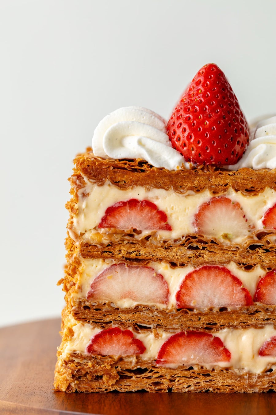 毎日店舗で焼き上げて作る特製ミルフィーユ。クロワッサン生地とパイ生地を特別な配合で織り込んだざくざく食感が特徴の特製パイ生地に、濃厚でコクのある自家製カスタードクリームと甘酸っぱい国産いちごをふんだんにサンドしました。店内でもテイクアウトでもお召し上がりいただけます。※数量限定となります。