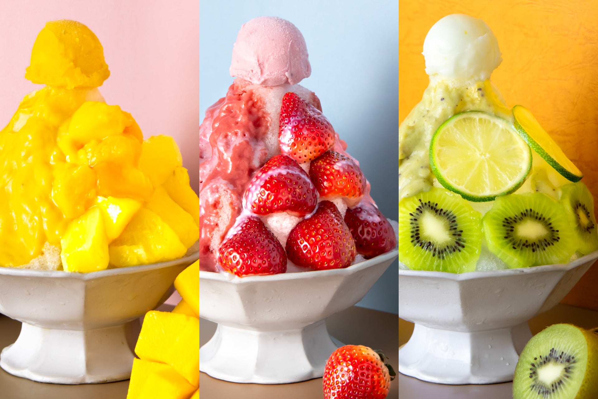 どっさりフルーツ、てっぺんにはフレーバーのアイスが乗って、ふわふわシェーブドアイスの中にはミルクプリンも入った満足度◎なかき氷が3種登場です。