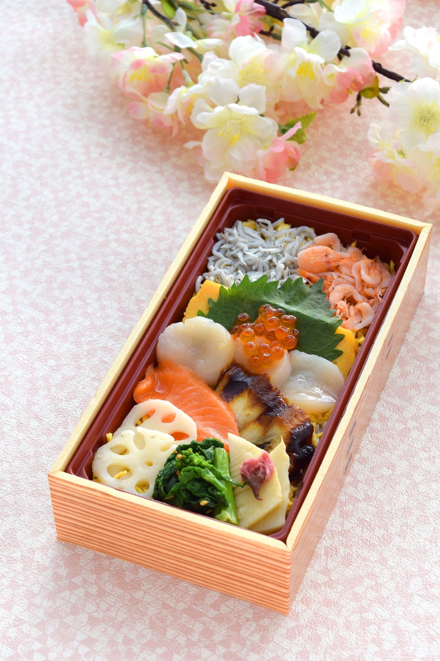 釜揚げしらすや桜海老、菜の花の辛子和えなど春を感じる食材をふんだんに盛りつけたちらし寿司です。