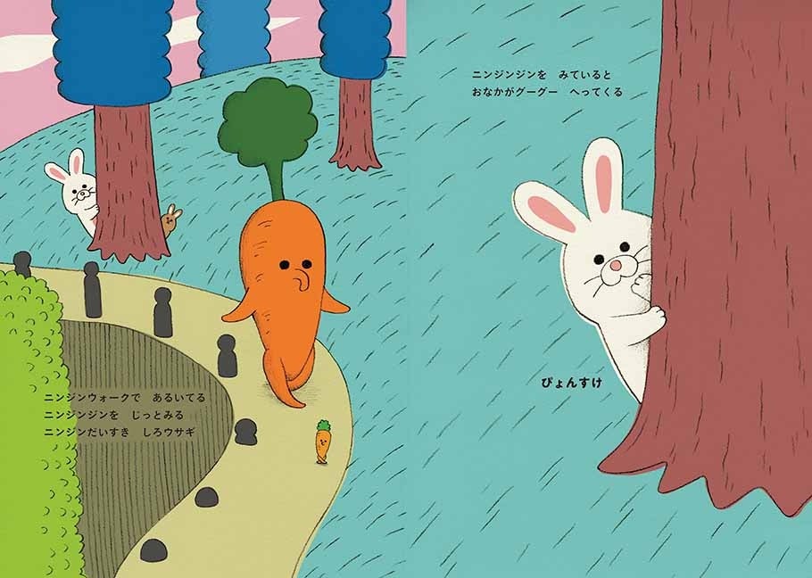 この度はこのような素敵な賞を賜り、誠にありがとうございます。「ニンジンジン」はこれまで描いてきた絵本の中でもっとも『読み聞かせの楽しさ』を意識して作ったものになります。読んでる人が七五調のリズムで楽しくなり、聞いてる子供も楽しくなる…楽しく穏やかな読み聞かせの風景…を独身男性の私が頭で想像しながら半笑いで描いたのがこの「ニンジンジン」なのです。