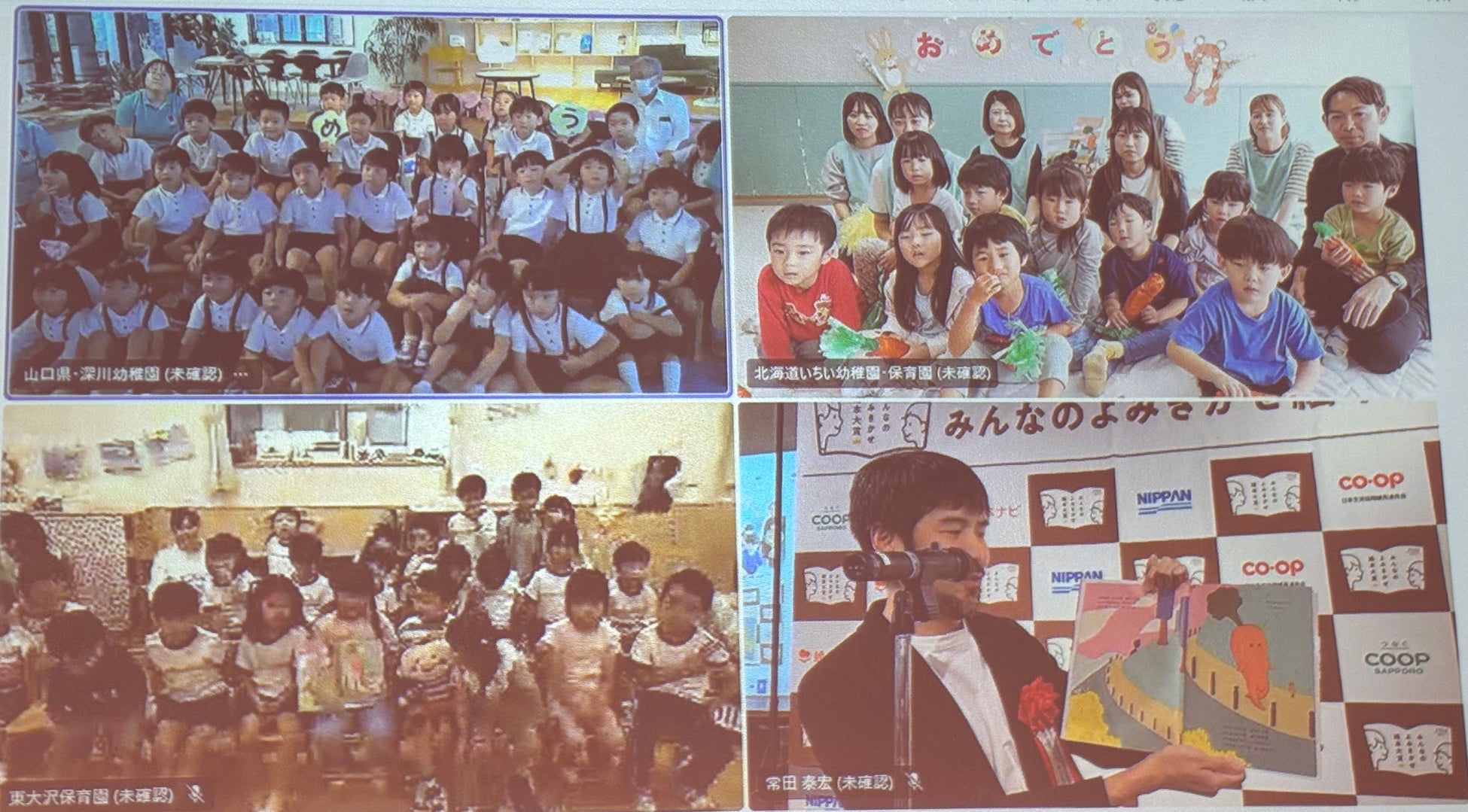 キューライス先生は、受賞後に投票してくれた3つの保育園・幼稚園の園児の園児に向けて、オンラインで読み聞かせを実施。手作りの大きなニンジンを用意してくれた園や、絵本のリズムのよさを楽しんだりしている子どもたちの様子に、キューライス先生もとても嬉しそうでした!