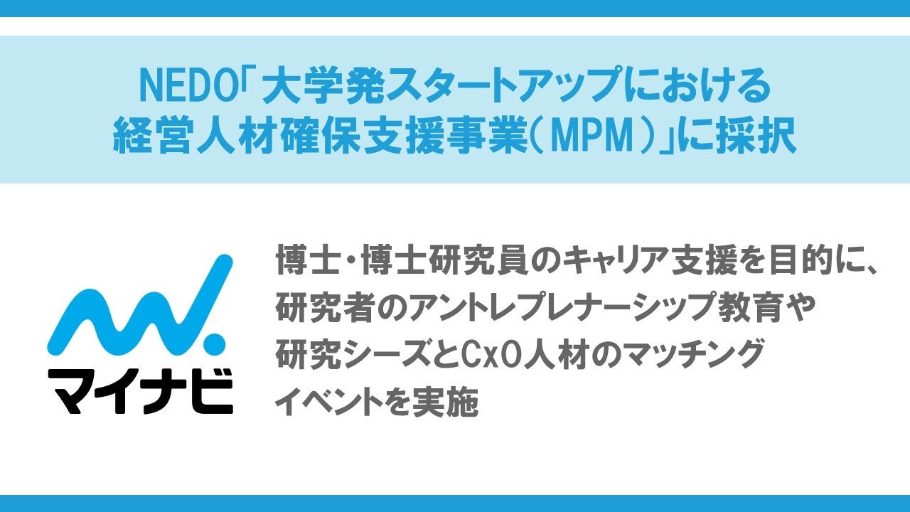 式会社マイナビ(本社:東京都千代田区、代表取締役 社長執行役員:土屋芳明)は、国立研究開発法人新エネルギー・産業技術総合開発機構(以下「NEDO」)が公募する 2024 年度「大学発スタートアップにおける経営人材確保支援事業(Management Personnel Matching program:以下「MPM」)の実施事業者として採択されました。
