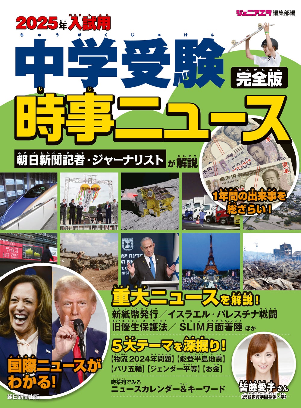 話題のニュースや時事問題を学ぶのに最適な『2025年入試用 中学受験時事ニュース 完全版』(朝日新聞出版)が2024年10月18日(金)に発売されました。小中学生向けのニュース月刊誌「ジュニアエラ」がこの1年間報じてきたニュースを、2025年入試の傾向を踏まえてわかりやすく一冊にまとめました。受験を目前に控えた小学生はもちろん、時事ニュースを学びたいすべての人たちにおすすめ。大きな写真やイラストを多く使った誌面で、家族で楽しく学べる一冊です。