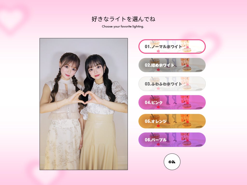 全6種類から選べるカラーライトを搭載。特に「暗めホワイト」を選ぶと、これまで撮影時の光で飛んでしまっていたペンライトなどの発光グッズの色味も綺麗に残せるように。持っている推し活グッズに合わせて撮影したり、推し色のカラーライトで撮影したり、楽しみ方は自由自在です。推し活グッズを目立たせた撮影で、これまで以上に推しへの愛を存分に表現いただけます。