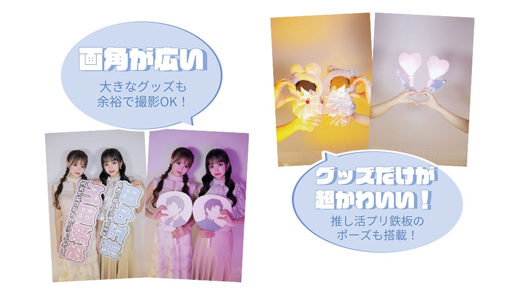 “推しごと”感をより一層楽しめるものを多数ご用意。ぬいぐるみなど推しを模したグッズだけでの撮影やグッズを持ったポーズ、推しへの愛を表現したものなど、推し・自分どちらを主役にしても盛れる推し活専用ポーズをお楽しみいただけます。