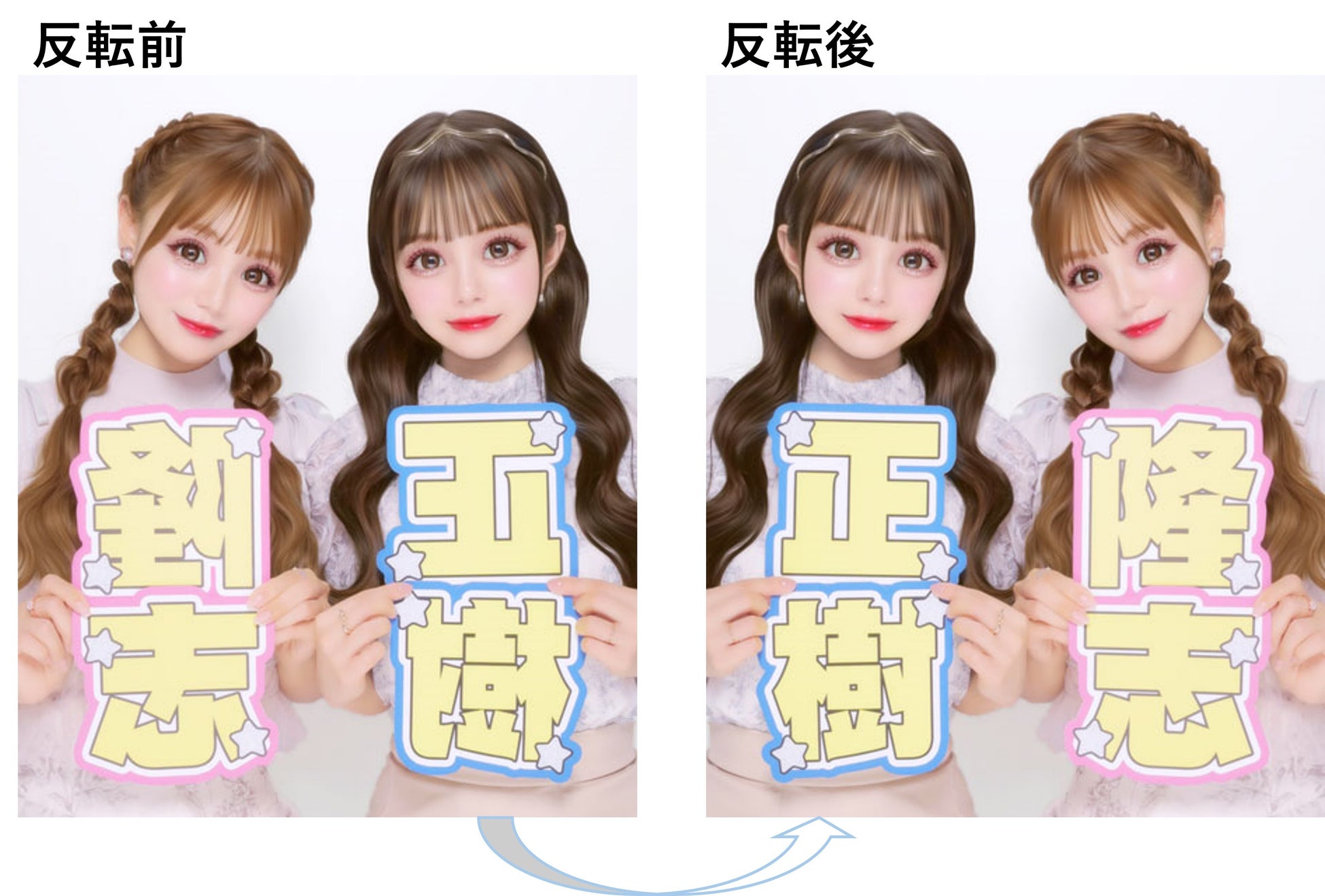 反転して写った文字入りグッズを元に戻せる機能「反転お直し選択」が登場。撮影後に反転したい画像を選ぶことができるため、使用した推し活グッズに合わせて1枚1枚反転の有無を選択することが可能です。推しの名前もしっかり残した推し活プリが完成します。