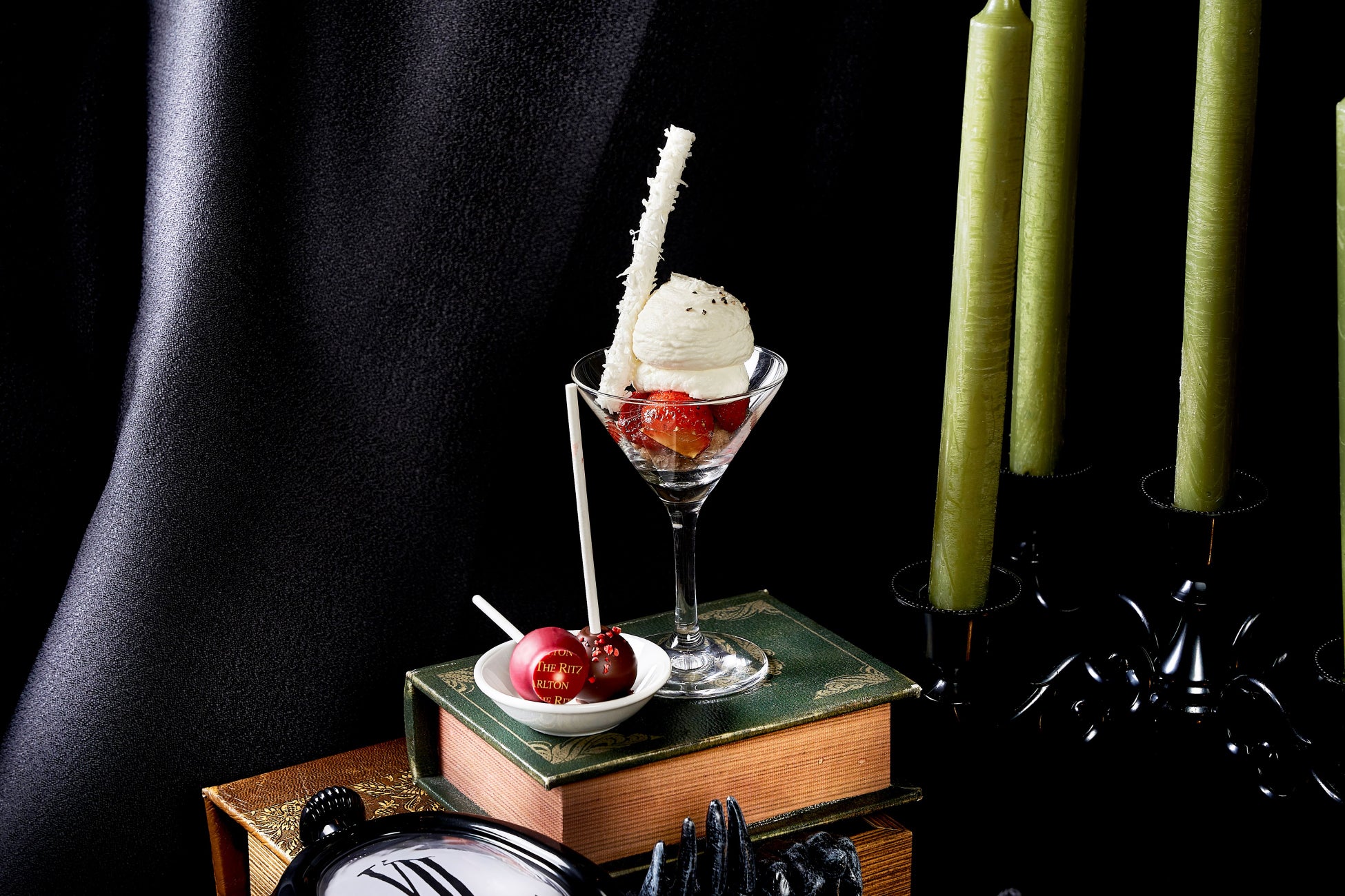 華やかな雰囲気に満ち、明るく人気者で、後に"善い魔女"と呼ばれるグリンダ。彼女からインスピレーションを得たスイーツも3点登場します。「ストロベリーライムバニラケーキ」は彼女のヘアピースのフラワーモチーフをあしらった、ライムのさわやかさとバニラのリッチな香りのペアリングが楽しい一品。ミニバッグをイメージしたスイーツは「ピスタチオバニラケーキ」でクリーミーでリッチな味わいです。パンプスをイメージして作ったのは「ストロベリームース」で、なめらかなムースに苺の風味が豊かに溶け合います。また、風味や酸味・甘みをダイレクトにお楽しみいただけるフレッシュ苺もご用意。心ゆくまでご堪能ください。