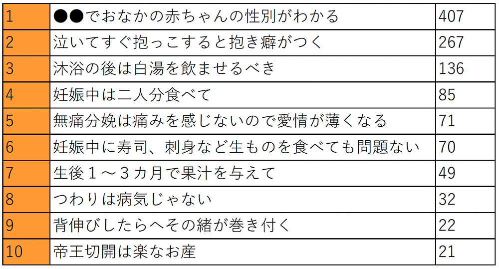 今回は、妊婦さんと0カ月~2歳までのお子さんをお持ちのママ3,753人に調査を実施。上位10位を発表します。また、たくさんの迷信や昔の「常識」、ジンクスについての体験談が集まりました。