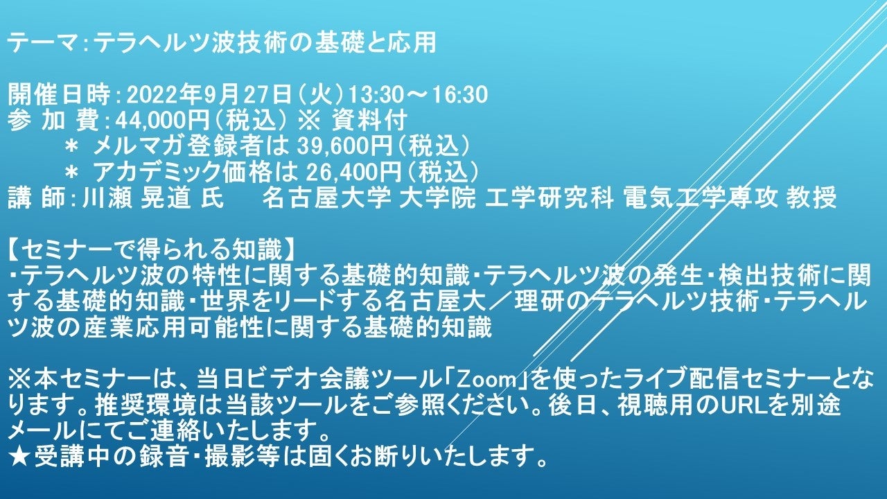 先端技術情報や市場情報を提供している(株)シーエムシー・リサーチ(千代田区神田錦町: https://cmcre.com/ )では、 各種材料・化学品などの市場動向・技術動向のセミナーや書籍発行を行っておりますが、 このたび「テラヘルツ波技術の基礎と応用」と題するセミナーを、 講師に川瀬 晃道 氏 名古屋大学 大学院 工学研究科 電気工学専攻 教授)をお迎えし、2022年9月27日(火)13:30より、 ZOOMを利用したライブ配信で開催いたします。 受講料は、 一般:44,000円(税込)、 弊社メルマガ会員:39,600円(税込)、 アカデミック価格は26,400円(税込)となっております(資料付)。