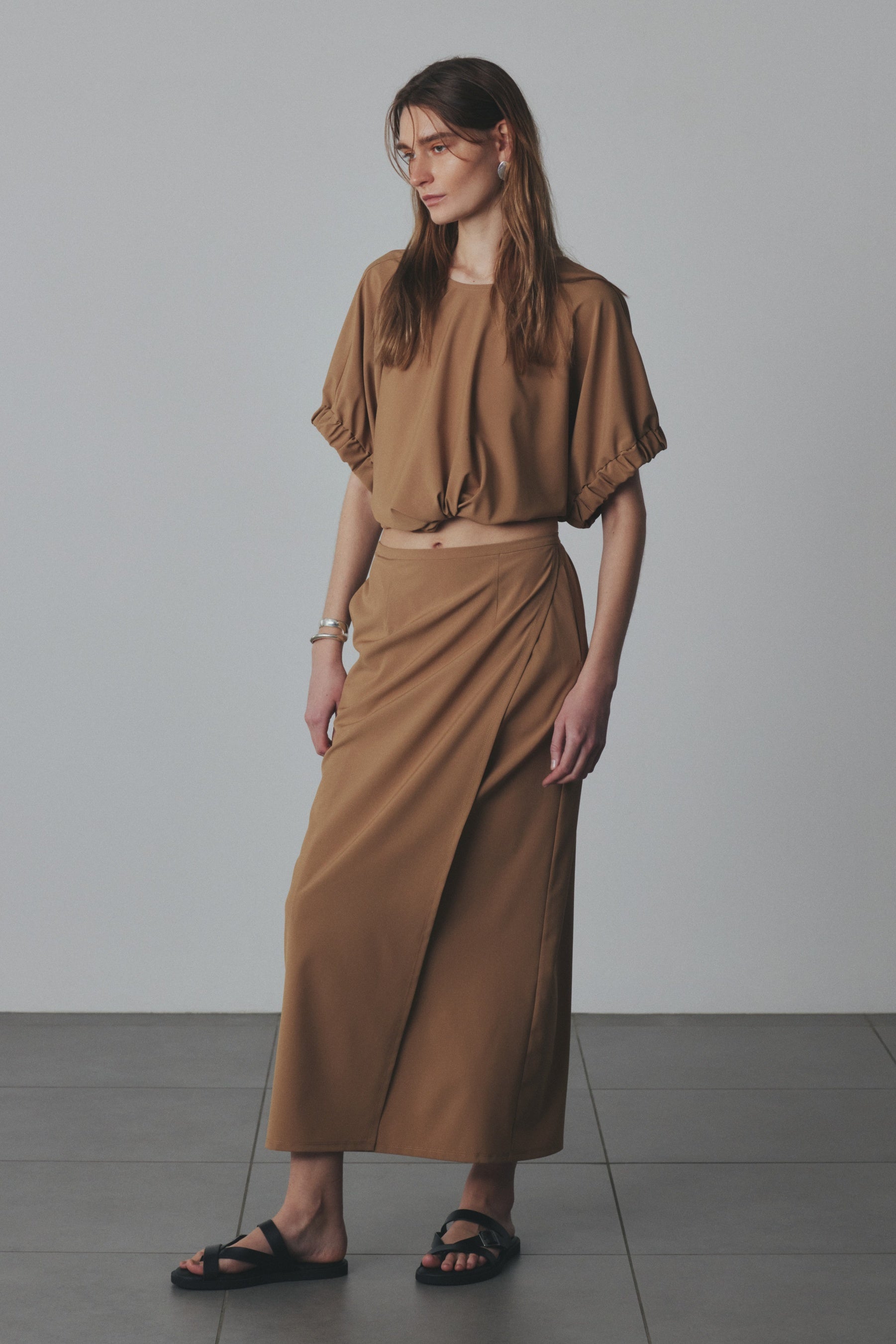 タイトシルエットながら伸縮性のある素材で着心地が良く、サイドのステッチ位置を工夫したことでスッキリと着用できるラップスカート。脚が露出しすぎないラップデザインにこだわった、大人が着やすい1枚です。