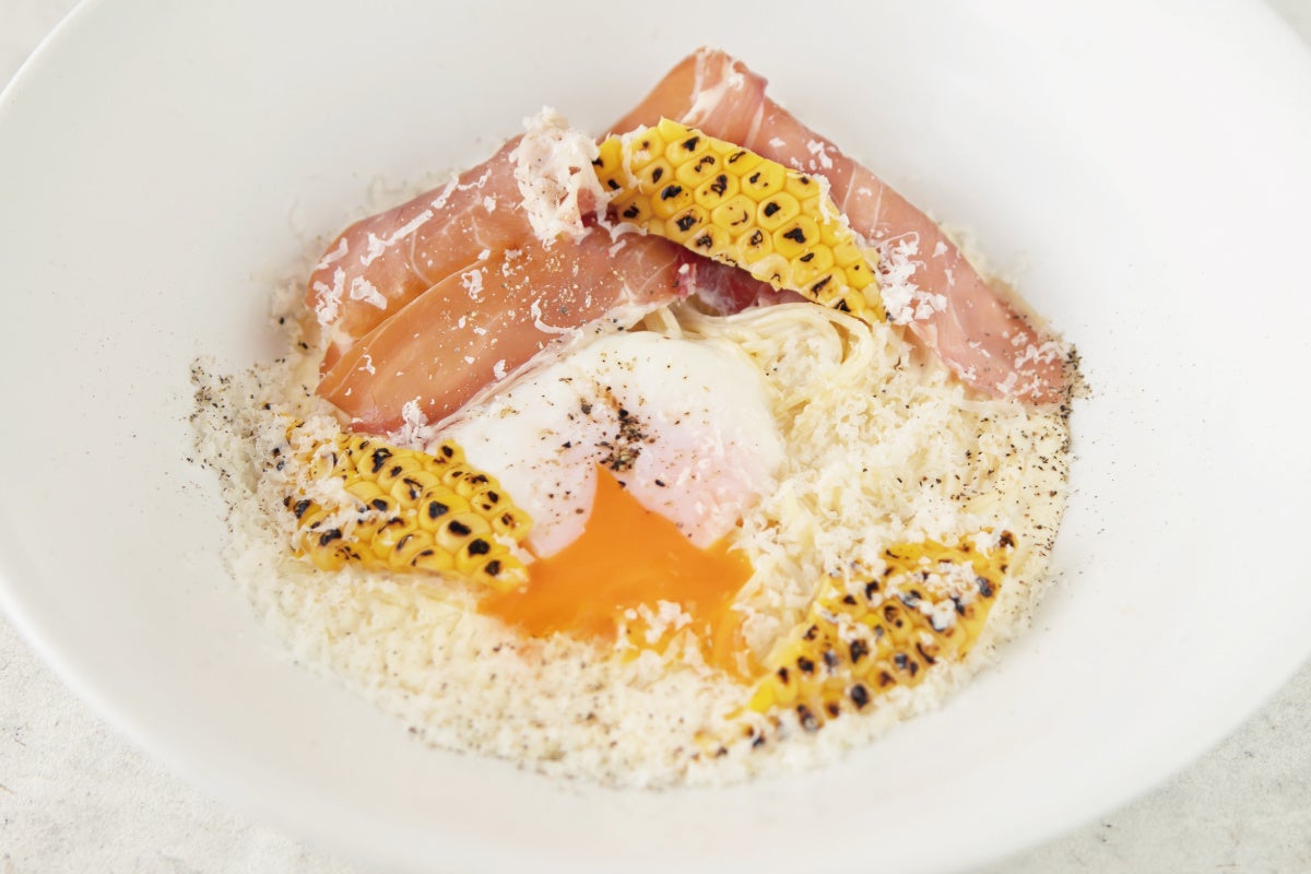 (右)淡路島産北坂たまごと生ハム、とうもろこしの冷製カルボナーラ
