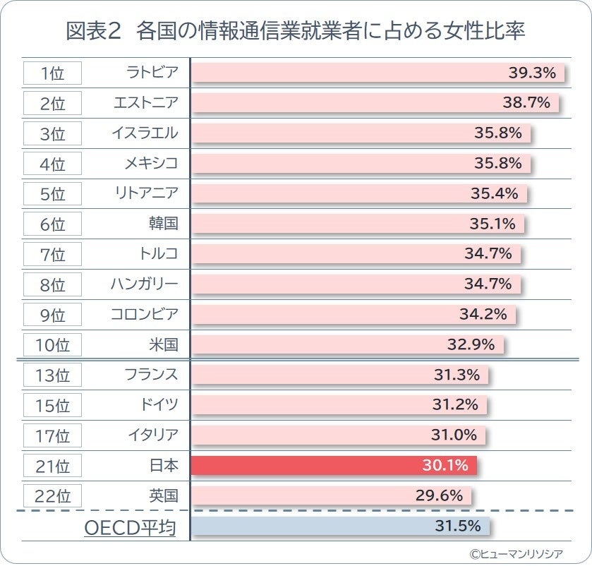 ●情報通信産業全体では女性比率30.1%で、主要国中21位