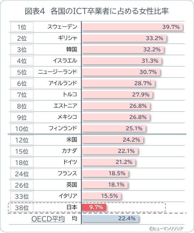 ●ITエンジニアに占める女性比率、日本は19.5%で主要国中14位
