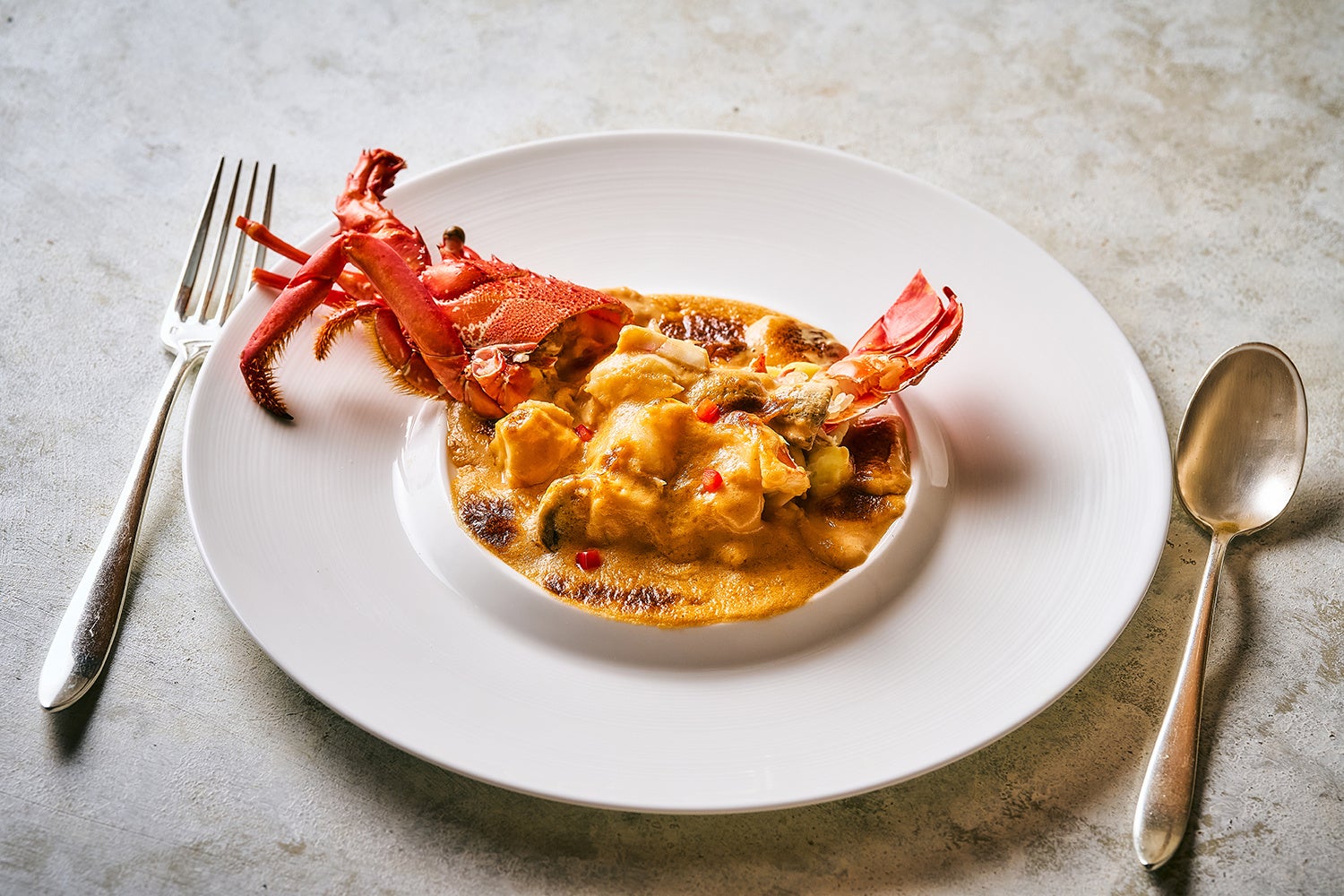千葉県産のイセエビに、白ワインソース、オマール海老の旨みを凝縮したアメリカンソースを合わせた濃厚な味わいのグラタン。付け合わせにマッシュルーム、バターライスを添えた代々のシェフに継承される贅沢な一品です。