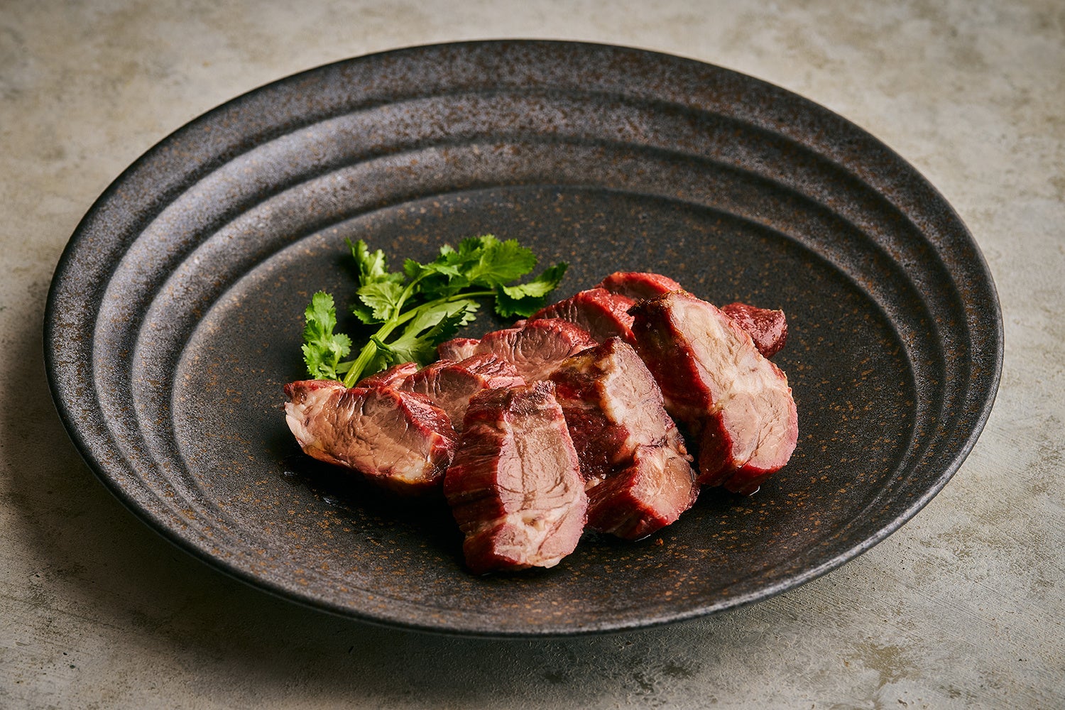 国産のハーブ豚を自家製の胡麻ベースのタレに一晩漬け込み、窯焼きでジューシーに仕上げた逸品。仕上げに甘みのある飴を塗り提供いたします。からしを合わせて召し上がるのもおすすめです。