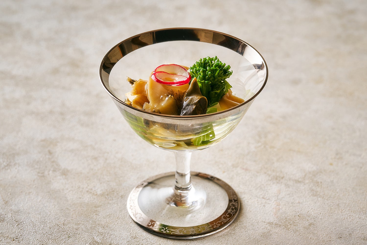 鮑の旨煮と季節野菜のお浸し 煎り酒ジュレ掛け