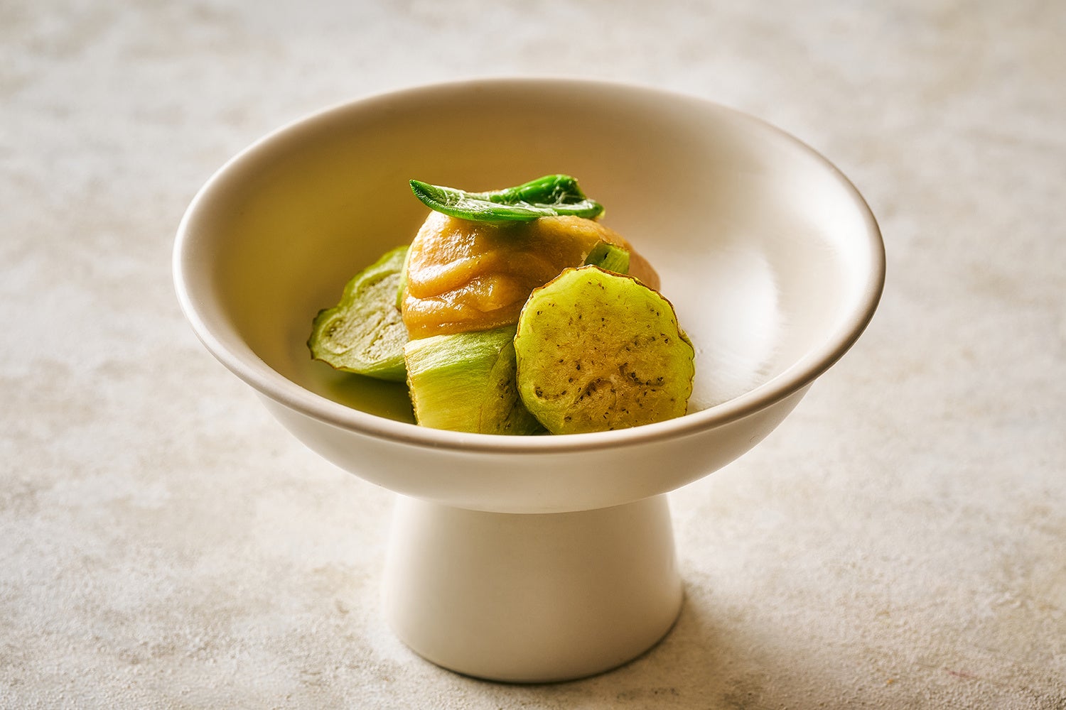 柔らかく焚いた蝦夷鮑と季節の野菜と盛り合わせ、梅干しを使って酸味を付けたこだわりの出汁を、ジュレ状にして掛けた逸品です。