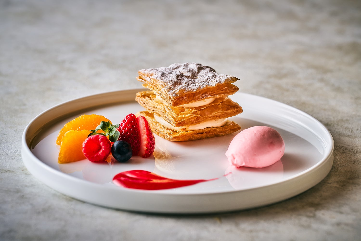 和食からは季節の食材にこだわった「旬の天ぷら盛り合わせ」、中国料理からは深い香りと風味が楽しめる「蝦夷鮑の葱・生姜風味蒸し」、洋食からは「オークラ伝統のコンソメスープ」や、見た目にも美しい「牛フィレ肉のポワレ ハーブバターをのせて グリーンペッパーソース」をご提供。さらに、デザートには注文を受けてから焼き上げる「ミルフィーユ」をご用意します。一度に和・洋・中の『こだわりの逸品』をお楽しみいただける贅沢なディナーコースです。