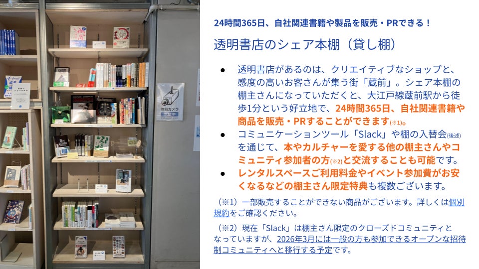 透明書店は、2023年4月にオープンして以降、新刊書籍の販売のみならず、スペースレンタルの開始、「独立したい系書店」をコンセプトにしたシェア本棚(棚貸し事業)の開始、古本の取り扱い開始、無人営業の開始など、さまざまな取り組みを推し進めています。